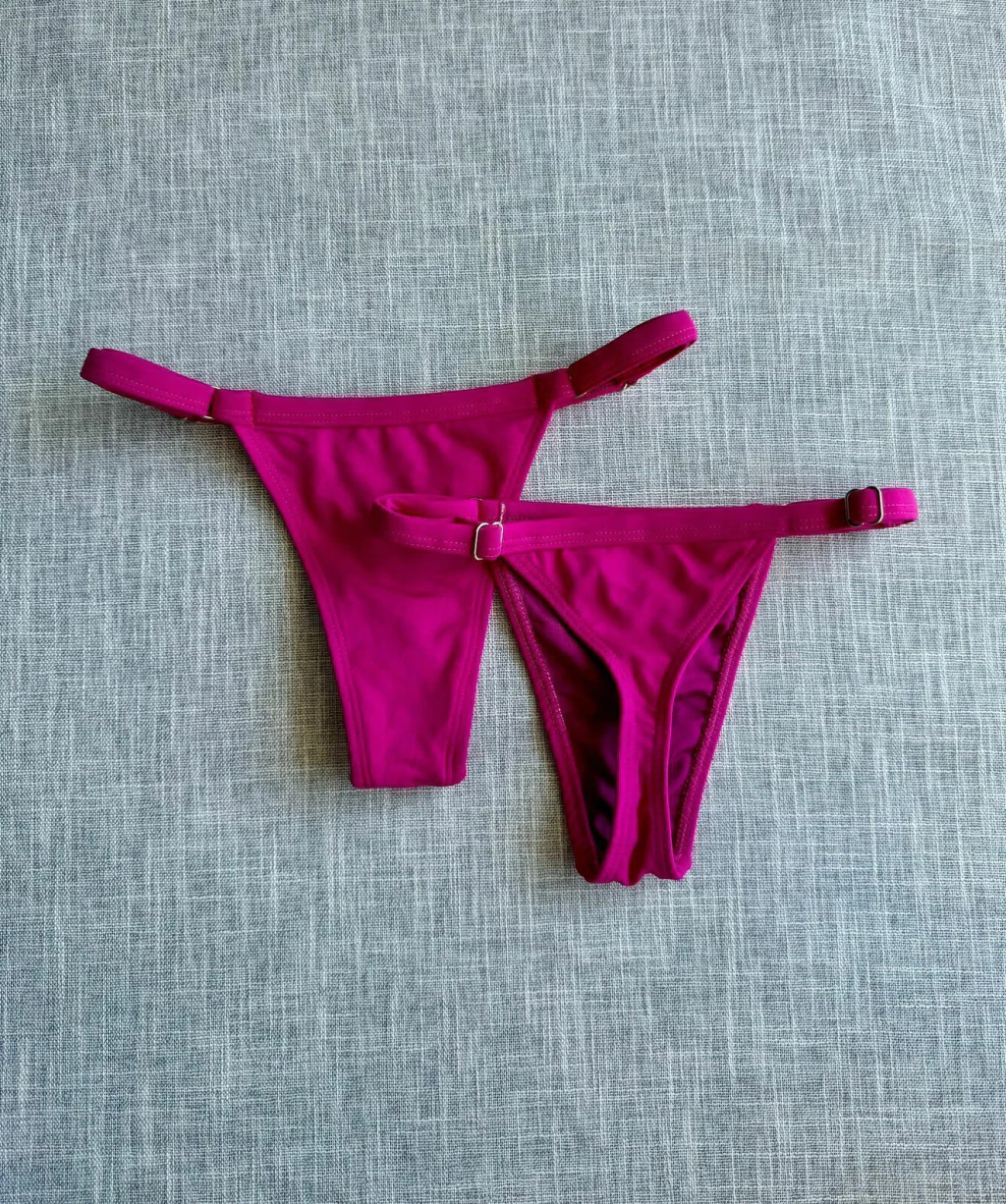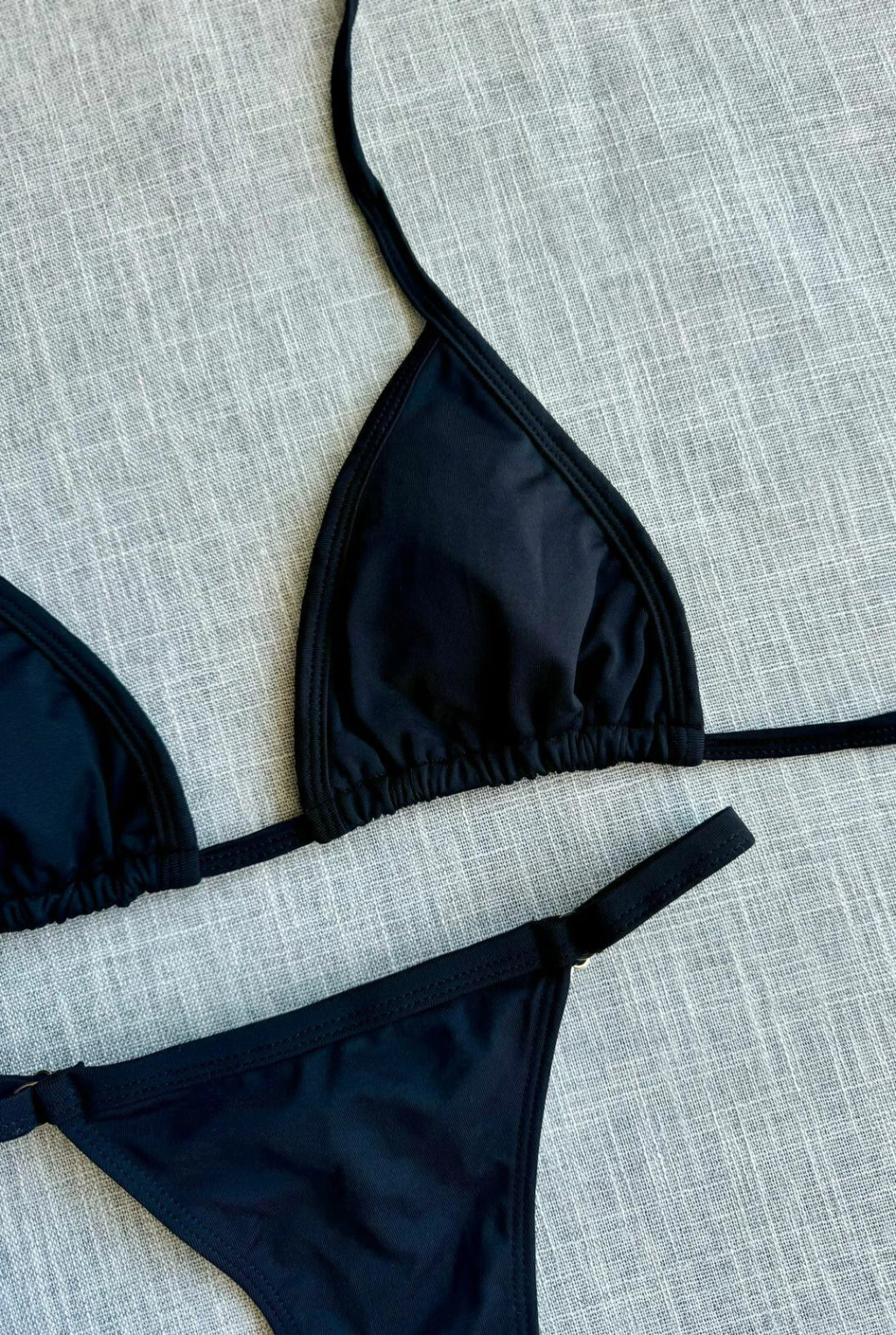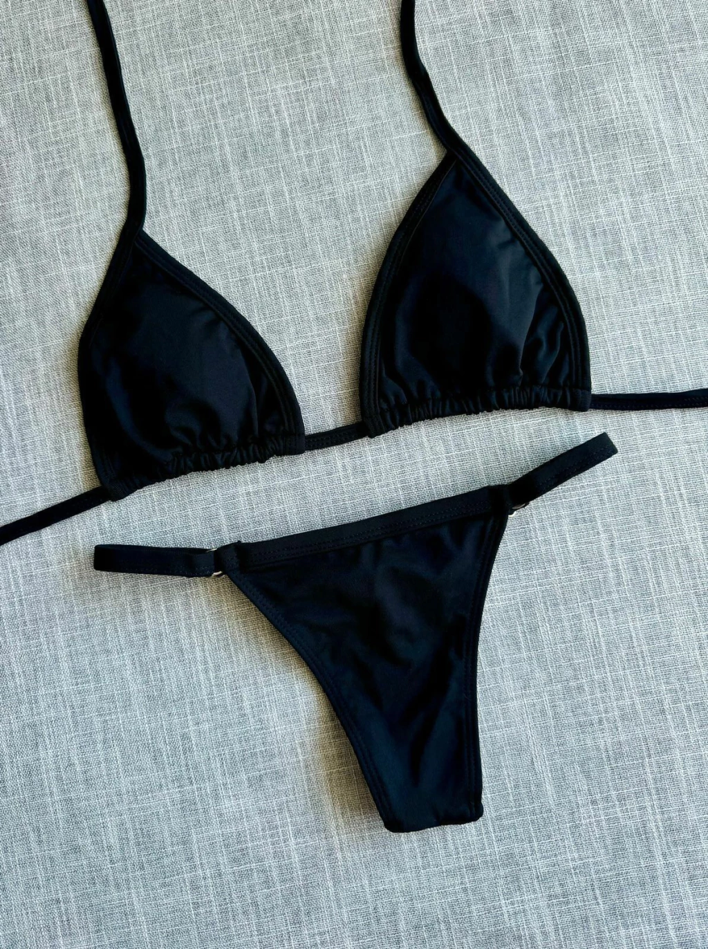 Ele é composto pelo sutiã cortininha e a calcinha com regulagem nas laterais com o bumbum fio dental.