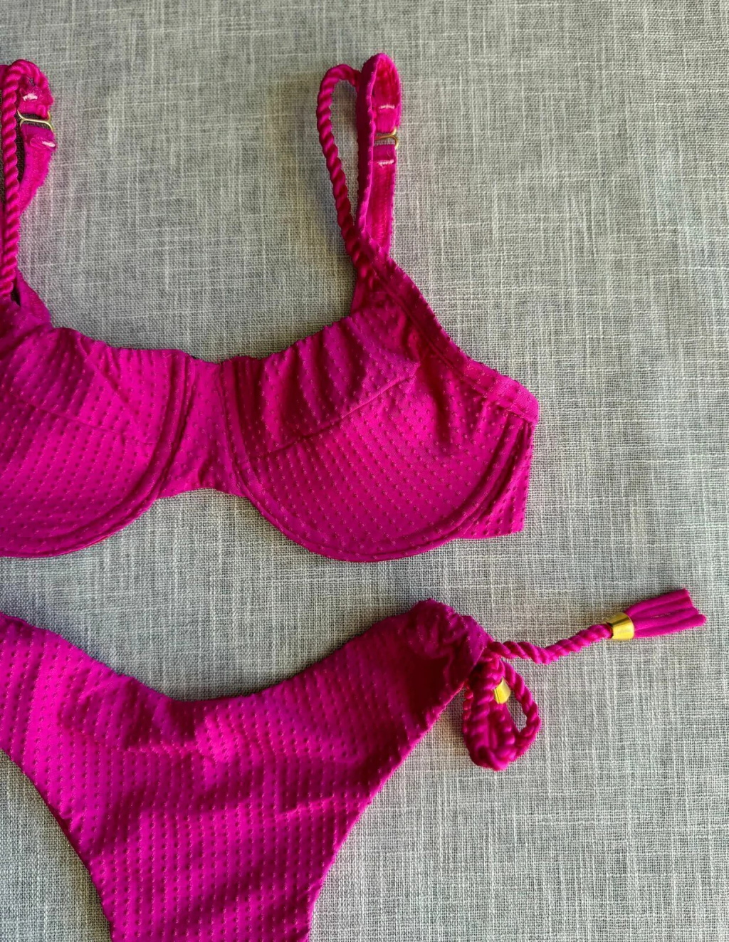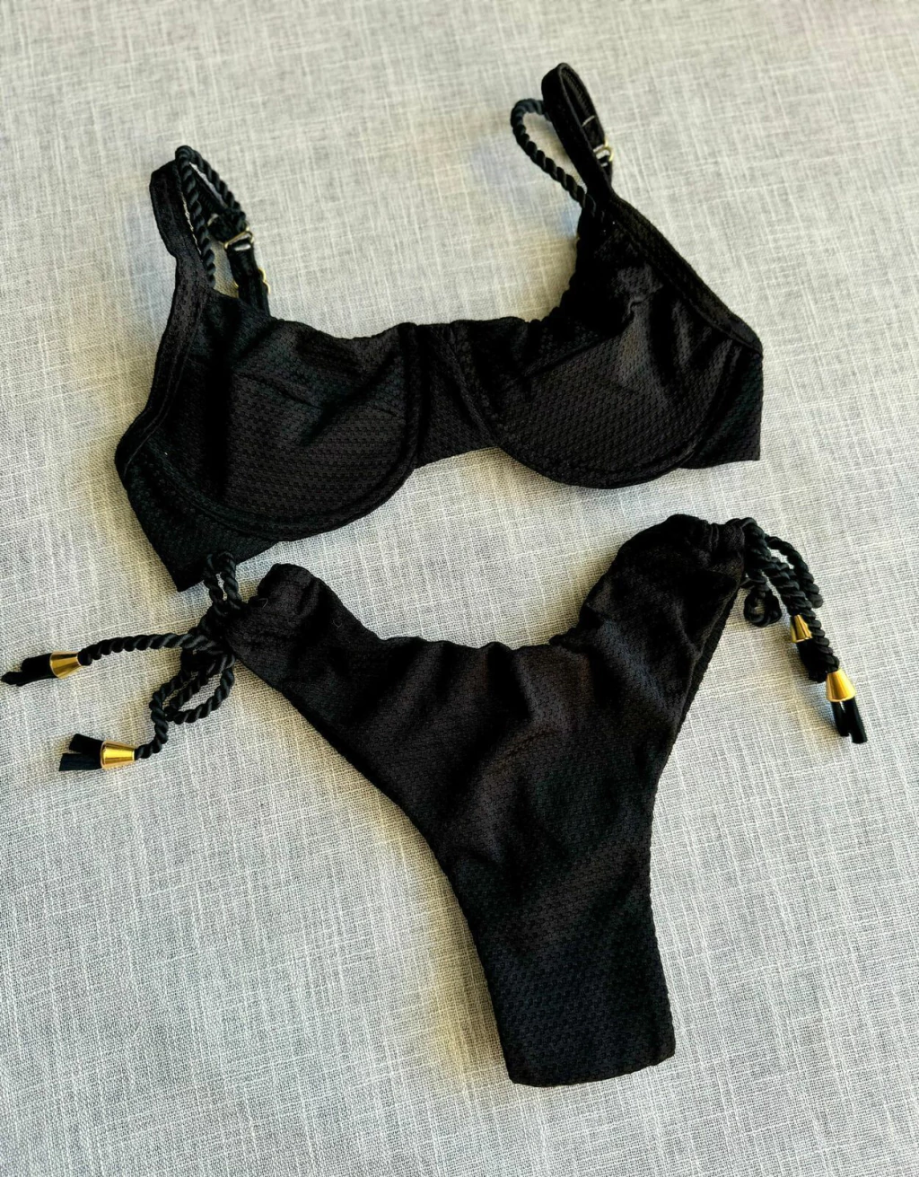 Nosso biquíni Lilian é composto pelo sutiã meia taça, que possui aros de sustentação, alças reguláveis e amarração nas costas e pra completar a calcinha asa dental fio duplo, com amarração nas laterais para seu maior conforto.