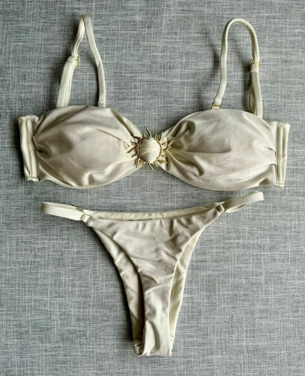 Top com detalhe de sol: Um toque de sofisticação que brilha nas suas aventuras à beira-mar e alças removíveis
